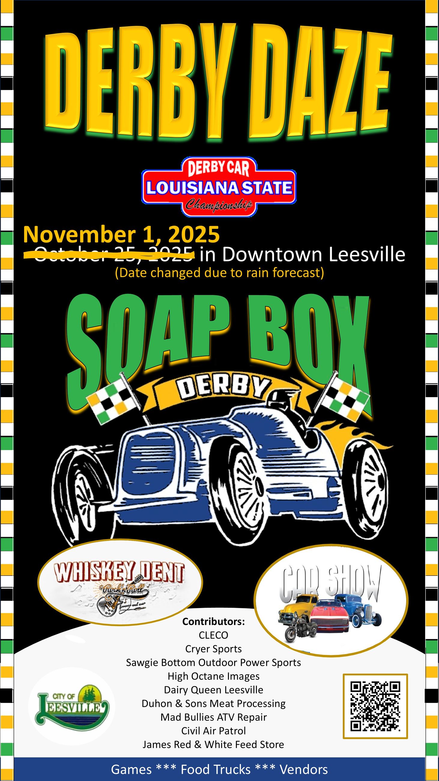 Derby Daze has been postponed until November 1st because of predicted thunderstorms this weekend. Everything else will remain the same. For more information, please call Grant Bush at 337-239-2444.